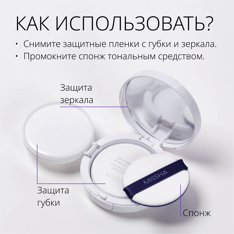 Перед началом использования снимите защитную плёнку, чтобы пользоваться внутренним зеркальцем. Наберите необходимое количество средства на спонж и распределите мягкими движениями по всей поверхности лица.