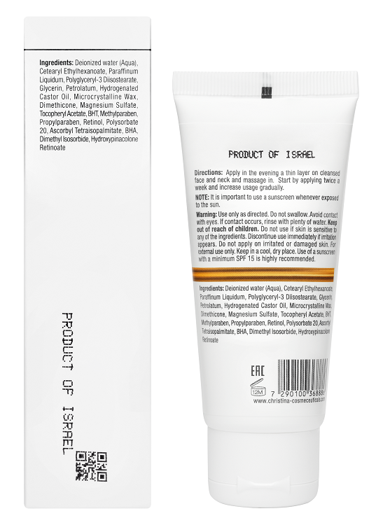 Ретинол ускоряет обновление эпидермиса, выравнивает рельеф. Сокращает проявления пигментации и делает тон однородным. При регулярном применении значительно уплотняет кожу. Витамин С в жирорастворимой форме благодаря высокой проникающей способности тормозит производство меланина и осветляет пигментацию. Витамин Е предотвращает окислительное повреждение липидов, нейтрализует свободные радикалы и восстанавливает уже поврежденные клетки. Способствует регенерации.