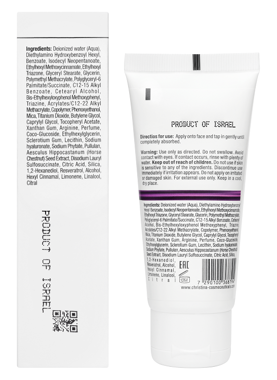 Гиалуроновая кислота, ресвератрол, экстракт конского каштана, триазон, триазин, диоксид титана, метоксициннамат, глицерин, ксантановая камедь, аргинин, лимонная кислота